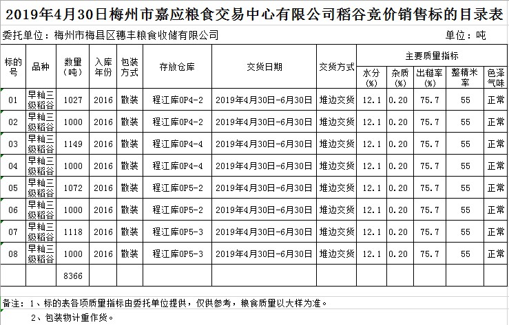 受客戶委托,梅州市嘉應糧食交易中心有限公司定于2019年4月30日(星期二)舉辦糧食競價交易會,梅州市梅縣區(qū)穗豐糧食收儲有限公司擬銷售2016年早秈稻8366噸。