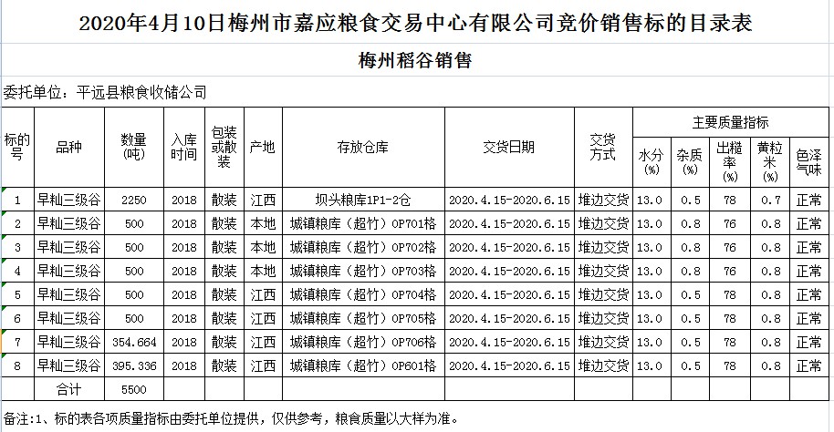 受客戶委托,梅州市嘉應(yīng)糧食交易中心有限公司定于2020年4月10日(星期五)舉辦糧食競價交易會,平遠(yuǎn)縣糧食收儲公司擬銷售2018年早秈稻5500噸。