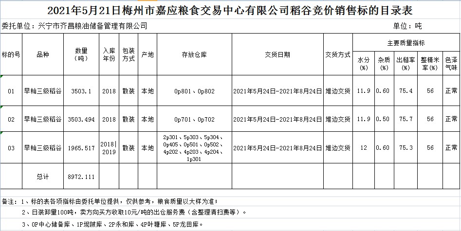 受客戶委托,梅州市嘉應(yīng)糧食交易中心有限公司定于2021年5月21日(星期五)舉辦糧食競(jìng)價(jià)交易會(huì)。興寧市齊昌糧油儲(chǔ)備管理有限公司擬銷售2018、2019年早秈稻8972.111噸。