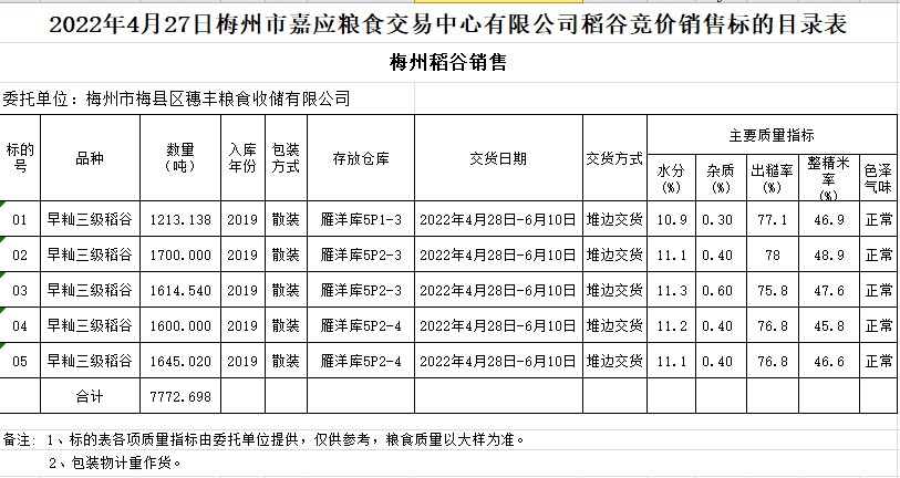 受客戶委托,梅州市嘉應糧食交易中心有限公司定于2022年4月27日(星期三)舉辦糧食競價交易會。梅州市梅縣區(qū)穗豐糧食收儲有限公司擬銷售2019年早秈稻7772.698噸。