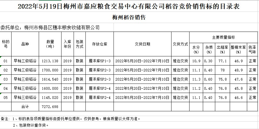 受客戶委托,梅州市嘉應(yīng)糧食交易中心有限公司定于2022年5月19日(星期四)舉辦糧食競(jìng)價(jià)交易會(huì)。梅州市梅縣區(qū)穗豐糧食收儲(chǔ)有限公司擬銷(xiāo)售2019年早秈稻7272.698噸。