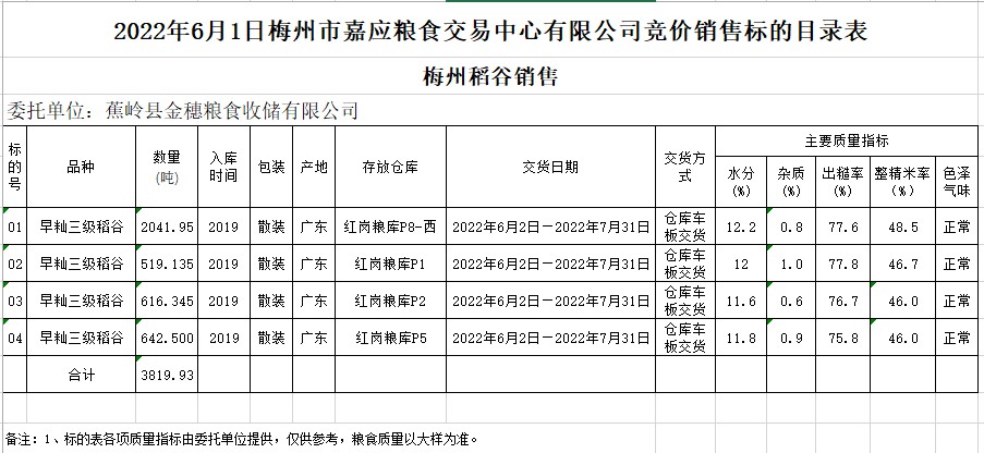 受客戶委托,梅州市嘉應(yīng)糧食交易中心有限公司定于2022年6月1日(星期三)舉辦糧食競(jìng)價(jià)交易會(huì)。蕉嶺縣金穗糧食收儲(chǔ)有限公司擬銷售2019年早秈稻3819.93噸。