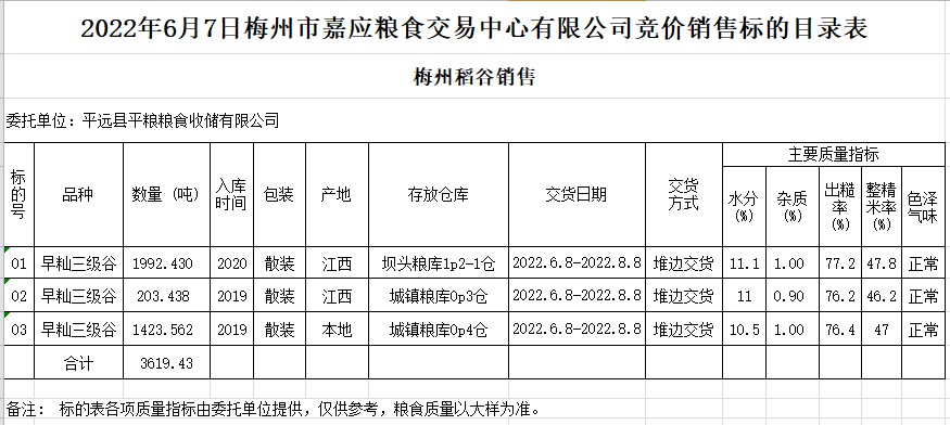 受客戶委托,梅州市嘉應(yīng)糧食交易中心有限公司定于2022年6月7日(星期二)舉辦糧食競價(jià)交易會。平遠(yuǎn)縣平糧糧食收儲有限公司擬銷售2019、2020年早秈稻3619.43噸。