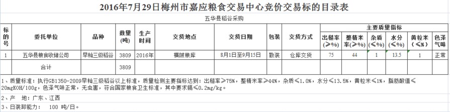 受客戶委托,梅州市嘉應(yīng)糧食交易中心有限公司定于2016年7月29日舉辦糧食競價交易會,廣東省五華縣糧食收儲公司擬采購2016年產(chǎn)早秈三級稻谷3809噸。