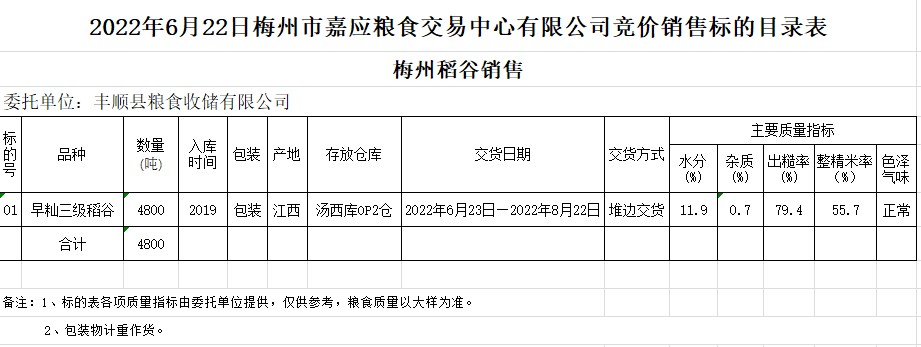 受客戶委托,梅州市嘉應(yīng)糧食交易中心有限公司定于2022年6月22日(星期三)舉辦糧食競(jìng)價(jià)交易會(huì)。豐順縣糧食收儲(chǔ)有限公司擬銷售2019年早秈稻4800噸。