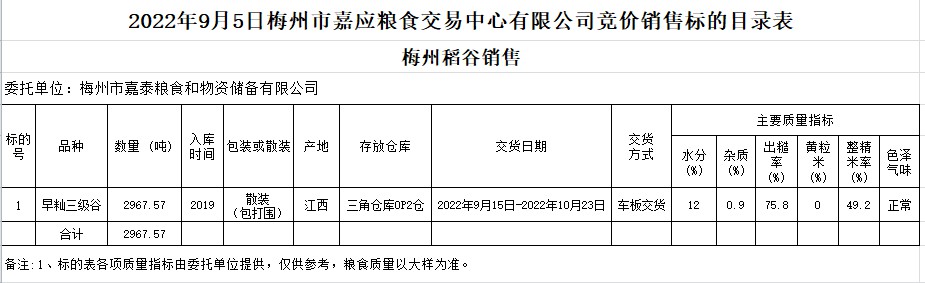 受客戶委托,梅州市嘉應糧食交易中心有限公司定于2022年9月5日(星期一)舉辦糧食競價交易會。梅州市嘉泰糧食和物資儲備有限公司擬銷售2019年早秈稻2967.57噸。