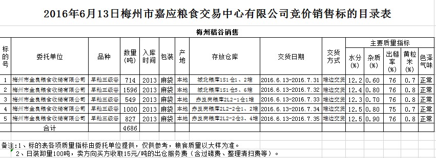 受客戶委托,梅州市嘉應(yīng)糧食交易中心有限公司定于2016年6月13日舉辦糧食競價(jià)交易會(huì),梅州市金良糧食收儲(chǔ)有限公司擬銷售2013年早秈稻谷4686噸。