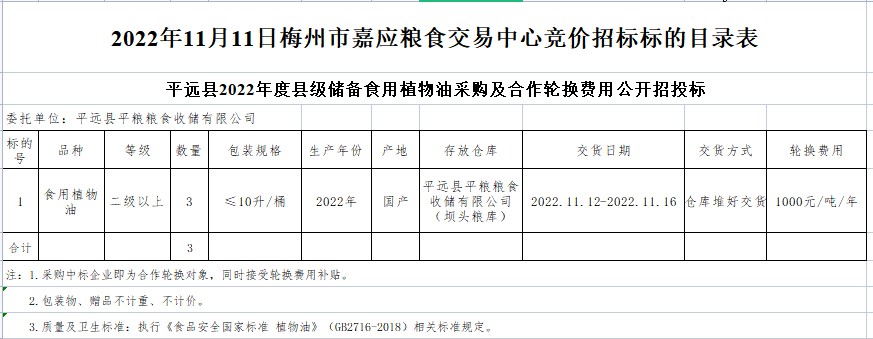 受客戶委托,梅州市嘉應(yīng)糧食交易中心有限公司定于2022年11月11日(星期五)上午10時05分在廣東省梅州市彬芳大道南161號梅州市糧食交易中心3樓,舉辦平遠(yuǎn)縣縣級食用植物油儲備采購及合作輪換費公開招標(biāo)。