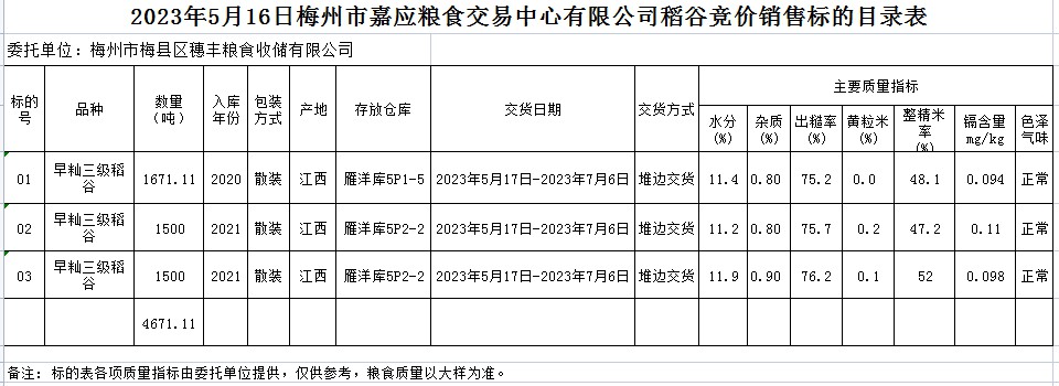 受客戶委托,梅州市嘉應(yīng)糧食交易中心有限公司定于2023年5月16日(星期二)舉辦糧食競價(jià)交易會(huì)。梅州市梅縣區(qū)穗豐糧食收儲有限公司擬銷售2020、2021年早秈稻4671.11噸。