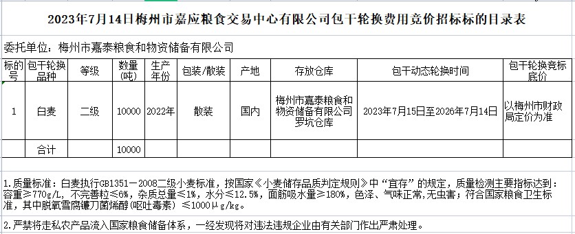 2023年7月14日梅州市2023年度市級儲備糧包干輪換公開招投標(biāo)公告