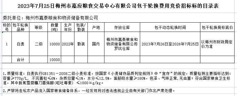 受客戶委托,梅州市嘉應(yīng)糧食交易中心有限公司定于2023年7月25日(星期二)上午10時30分在梅州市嘉應(yīng)糧食交易中心有限公司舉辦梅州市市級儲備糧小麥包干輪換(自主輪換)公開招標(biāo)。