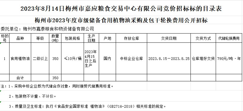 2023年8月14日梅州市嘉泰糧食和物資儲備有限公司市級儲備食用植物油采購及包干輪換費用公開招投標公告