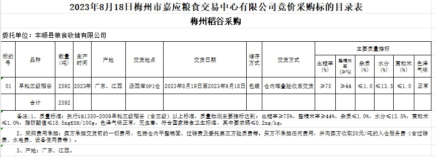 受客戶委托,梅州市嘉應糧食交易中心有限公司定于2023年8月18日(星期五)舉辦糧食競價交易會。豐順縣糧食收儲有限公司擬采購2023年早秈稻2592噸。
