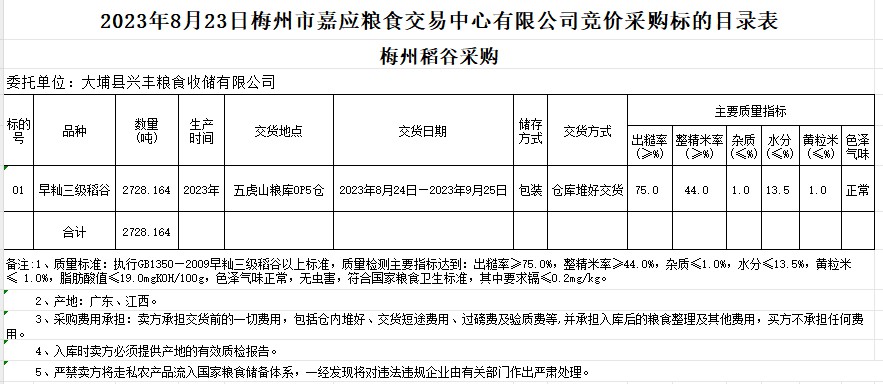 2023年8月23日大埔縣興豐糧食收儲(chǔ)有限公司稻谷采購