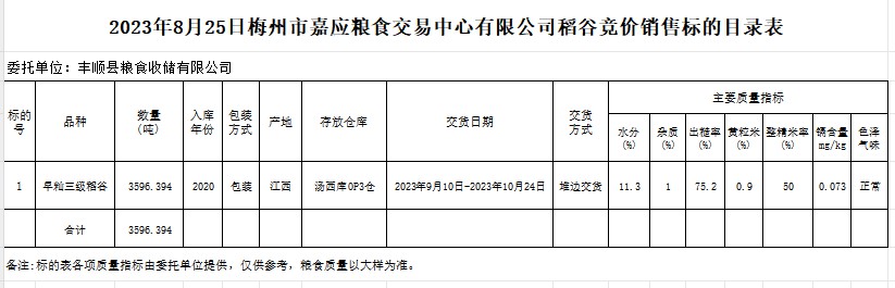 2023年8月25日豐順縣糧食收儲有限公司稻谷銷售