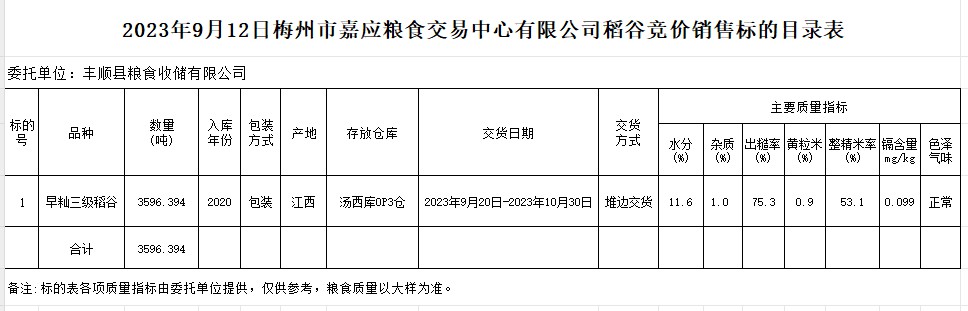 受客戶委托,梅州市嘉應糧食交易中心有限公司定于2023年9月12日(星期二)舉辦糧食競價交易會。豐順縣糧食收儲有限公司擬銷售2020年早秈稻3596.394噸。