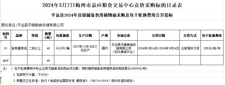 受平遠(yuǎn)縣平糧糧食收儲(chǔ)有限公司委托,梅州市嘉應(yīng)糧食交易中心有限公司定于2024年3月7日(星期四)上午10時(shí)舉辦平遠(yuǎn)縣2024年縣級(jí)儲(chǔ)備食用植物油采購(gòu)及包干輪換費(fèi)用公開招標(biāo)。