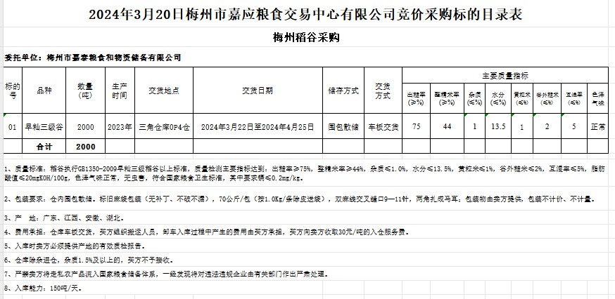 受客戶委托,梅州市嘉應糧食交易中心有限公司定于2024年3月20日(星期三)舉辦糧食競價交易會。梅州市嘉泰糧食和物資儲備有限公司擬采購2023年早秈稻2000噸。
