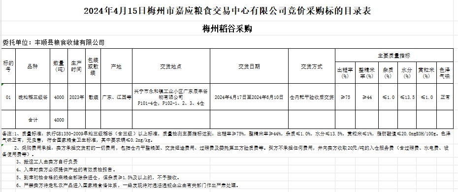 受客戶委托,梅州市嘉應(yīng)糧食交易中心有限公司定于2024年4月15日(星期一)舉辦糧食競價(jià)交易會(huì)。豐順縣糧食收儲(chǔ)有限公司擬采購2023年產(chǎn)晚秈稻4000噸。
