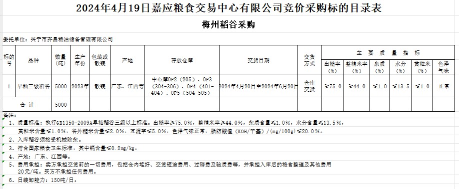 受客戶委托,梅州市嘉應糧食交易中心有限公司定于2024年4月19日(星期五)舉辦糧食競價交易會。興寧市齊昌糧油儲備管理有限公司擬采購2023年產早秈稻5000噸。