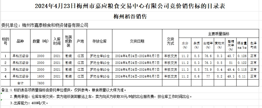 受客戶委托,梅州市嘉應(yīng)糧食交易中心有限公司定于2024年4月23日(星期二)舉辦糧食競(jìng)價(jià)交易會(huì)。梅州市嘉泰糧食和物資儲(chǔ)備有限公司擬銷(xiāo)售2021年產(chǎn)早秈稻7600噸。