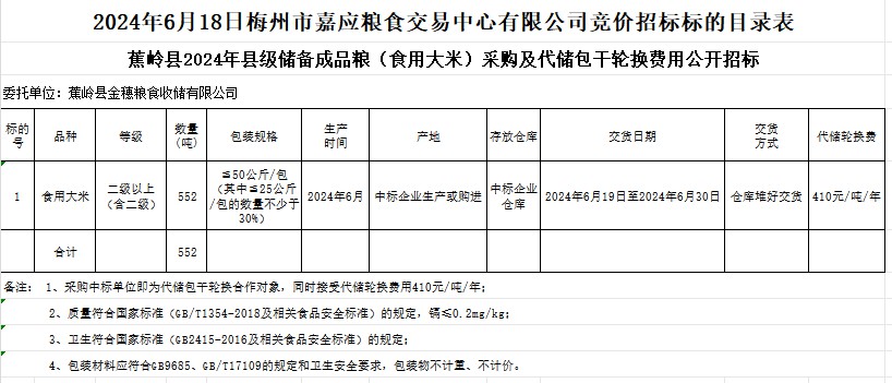 受客戶委托,梅州市嘉應(yīng)糧食交易中心有限公司定于2024年6月18日(星期二)上午10時在廣東省梅州市彬芳大道南161號梅州市糧食交易中心3樓,舉辦蕉嶺縣2024年縣級儲備成品糧(食用大米)采購及代儲包干輪換費用公開招標(biāo)。