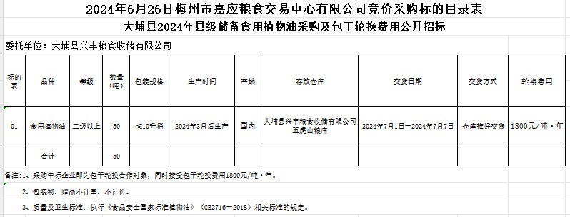 受大埔縣興豐糧食收儲有限公司委托,梅州市嘉應(yīng)糧食交易中心有限公司定于2024年6月26日(星期三)上午10時(shí)在廣東省梅州市彬芳大道南161號梅州市糧食交易中心3樓,舉辦大埔縣2024年縣級儲備食用植物油采購及包干輪換費(fèi)用公開招標(biāo)。