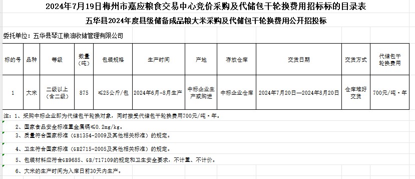 五華縣2024年度縣級儲備成品糧大米采購及代儲包干輪換費用公開招標公告