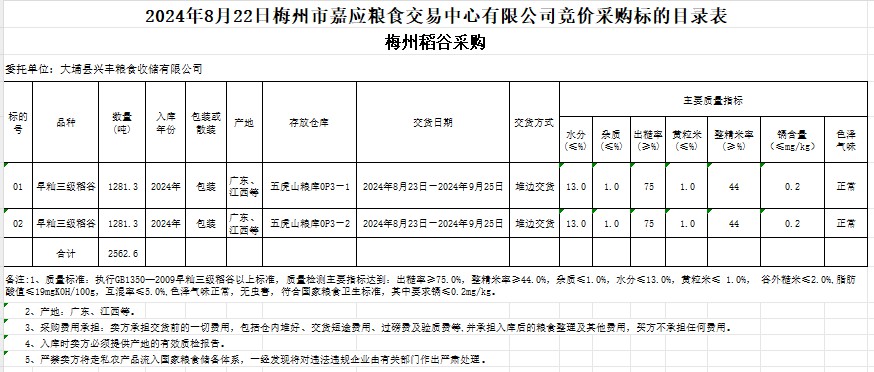 受客戶委托,梅州市嘉應(yīng)糧食交易中心有限公司定于2024年8月22日(星期四)舉辦糧食競價(jià)交易會(huì)。大埔縣興豐糧食收儲有限公司擬采購2024年產(chǎn)早秈稻谷2562.6噸。