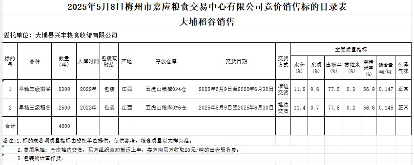 受客戶委托,梅州市嘉應(yīng)糧食交易中心有限公司定于2025年5月8日(星期四)舉辦糧食競價交易會。大埔縣興豐糧食收儲有限公司擬銷售2022年產(chǎn)早秈稻谷4800噸。