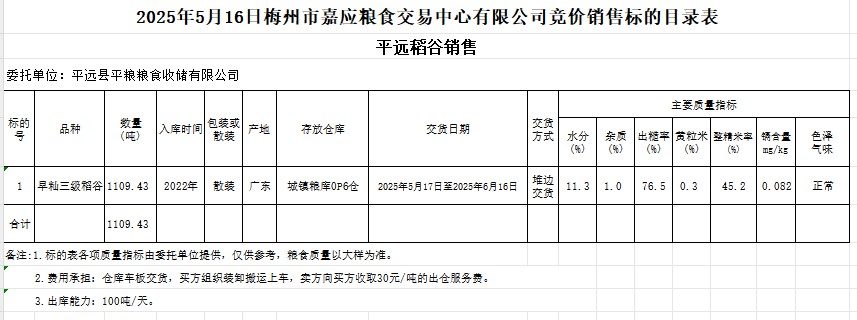 受客戶委托,梅州市嘉應糧食交易中心有限公司定于2025年5月16日(星期五)舉辦糧食競價交易會。平遠縣平糧糧食收儲有限公司擬銷售2022年產(chǎn)早秈稻谷1109.43噸。