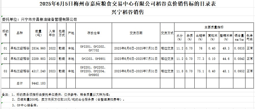受客戶委托,梅州市嘉應(yīng)糧食交易中心有限公司定于2025年6月5日(星期四)舉辦糧食競價交易會。興寧市齊昌糧油儲備管理有限公司擬銷售2022年、2023年產(chǎn)早秈稻谷9442.183噸。