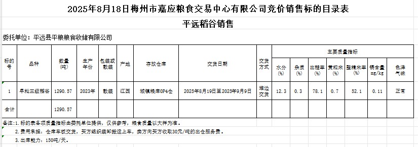 受客戶委托,梅州市嘉應糧食交易中心有限公司定于2025年8月18日(星期一)舉辦糧食競價交易會。平遠縣平糧糧食收儲有限公司擬銷售2023年產(chǎn)早秈稻谷1290.57噸。