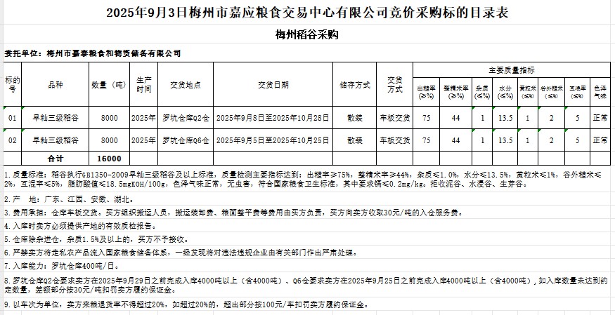受客戶(hù)委托,梅州市嘉應(yīng)糧食交易中心有限公司定于2025年9月3日(星期三)舉辦糧食競(jìng)價(jià)交易會(huì)。梅州市嘉泰糧食和物資儲(chǔ)備有限公司擬采購(gòu)2025年產(chǎn)早秈稻谷16000噸。