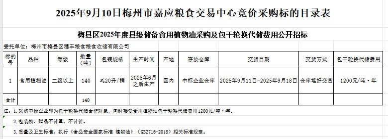 梅縣區(qū)2025年度縣級(jí)儲(chǔ)備食用植物油采購及包干輪換代儲(chǔ)費(fèi)用公開招標(biāo)公告
