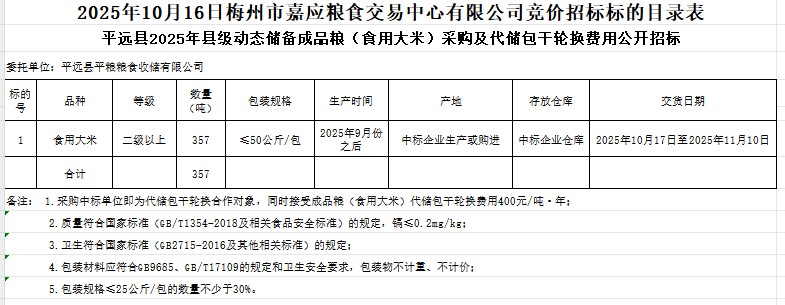 平遠縣2025年縣級動態(tài)儲備成品糧(食用大米)采購及代儲包干輪換費用公開招標公告