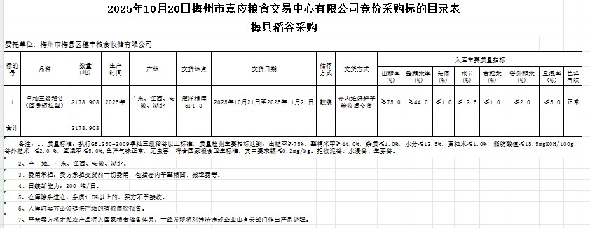 受客戶委托,梅州市嘉應(yīng)糧食交易中心有限公司定于2025年10月20日(星期一)舉辦糧食競價(jià)交易會。梅州市梅縣區(qū)穗豐糧食收儲有限公司擬采購2025年產(chǎn)早秈稻谷3178.908噸。