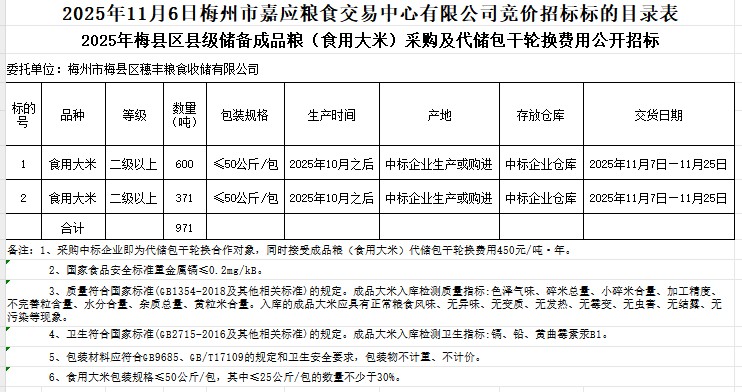 梅縣區(qū)2025年縣級儲備成品糧(食用大米)采購及代儲包干輪換費(fèi)用公開招標(biāo)公告