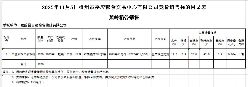 受客戶委托,梅州市嘉應(yīng)糧食交易中心有限公司定于2025年11月5日(星期三)舉辦糧食競(jìng)價(jià)交易會(huì)。蕉嶺縣金穗糧食收儲(chǔ)有限公司擬銷售2023年產(chǎn)中晚秈稻谷2200噸。