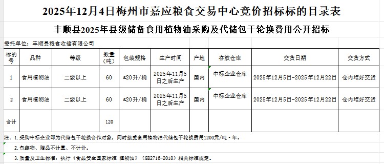 品種為食用植物油,等級(jí):二級(jí)及以上,數(shù)量共計(jì)120噸(分2個(gè)標(biāo)的),包裝規(guī)格≤20升/桶,代儲(chǔ)包干輪換期限為2026年1月1日至2026年12月31日止。