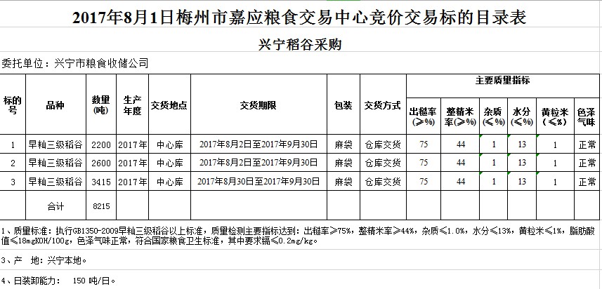 受客戶(hù)委托,梅州市嘉應(yīng)糧食交易中心有限公司定于2017年8月1日舉辦糧食競(jìng)價(jià)交易會(huì),興寧市糧食收儲(chǔ)公司擬采購(gòu)2017年早秈三級(jí)稻谷共8215噸。