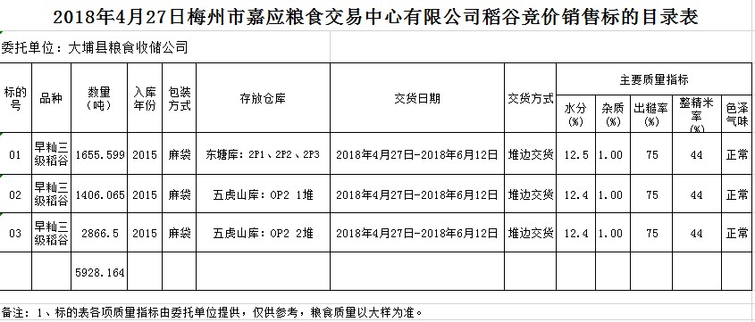 受客戶委托,梅州市嘉應(yīng)糧食交易中心有限公司定于2018年4月27日(星期五)舉辦糧食競(jìng)價(jià)交易會(huì),大埔縣糧食收儲(chǔ)公司擬銷售早秈稻5928.164噸。