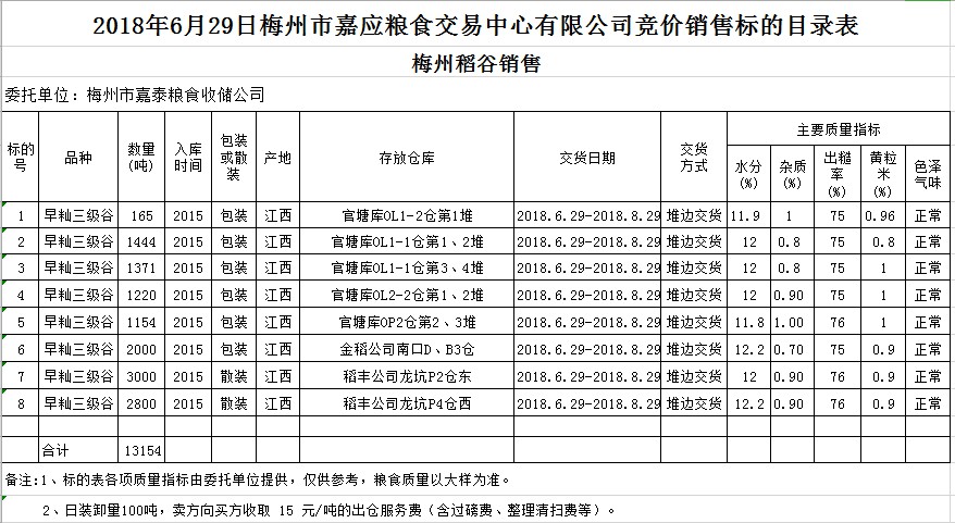 受客戶委托,梅州市嘉應(yīng)糧食交易中心有限公司定于2018年6月29日(星期五)舉辦糧食競價(jià)交易會(huì),梅州市嘉泰糧食收儲(chǔ)公司擬銷售早秈稻13154噸。