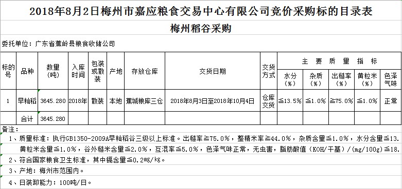 受客戶委托,梅州市嘉應(yīng)糧食交易中心有限公司定于2018年8月2日舉辦糧食競價交易會,廣東省蕉嶺縣糧食收儲公司擬采購2018年產(chǎn)早秈三級稻谷3645.28噸。