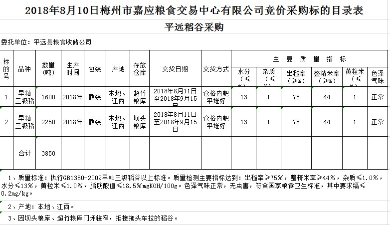 交易時間和地點:2018年8月10日(星期五)上午10時。廣東省梅州市彬芳大道南161號梅州市糧食交易中心3樓。